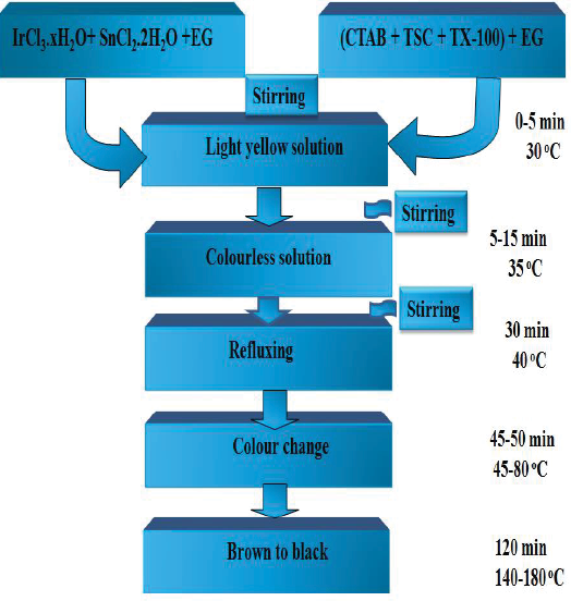 All reagents are of analytical grade and used without further purification. Iridium trichloride (IrCl3.xH2O), tin chloride (SnCl2.2H2O) (precursor salts) and ethylene glycol (solvent and reducing agent) were purchased from Sisco Research Laboratory, Mumbai. Sodium hydroxide pellets were obtained from Merck. Cationic (CTAB), anionic (TSC) and nonionic (TX-100) surfactants purchased from Thomas Baker were used as a stabilizing agent. All solutions were prepared in double-distilled water.