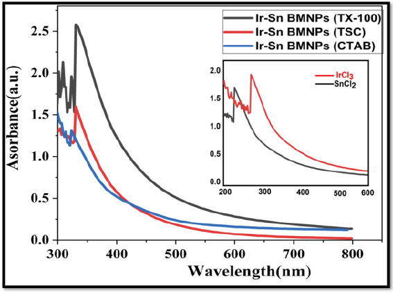 In the present work, the surfactant assisted Ir-Sn BMNP samples with molar ratios 2:1 using precursor salts of iridium chloride (IrCl3.xH2O) and tin chloride (SnCl2.2H2O) were synthesized using modified polyol reduction method [50]. Precursor salts of iridium tri chloride and tin chloride in 2:1 molar ratios were dissolved in 25 ml ethylene glycol. Stabilizers act as capping agents, which provide a coating around the particles, this satisfy the high energy of particles and skip them from agglomeration. CTAB, TSC and TX-100 are the most common and frequently used stabilizers. The pH of solution was alter by addition of 1 ml NaOH added slowly into the reaction mixture [51]. After being stirred at room temperature, the entire solution was refluxed for 2 h in oil bath at 140-180 ˚C temperature. After refluxing, the color of the solution becomes blackish brown from pale yellow. The flowchart of the method is demonstrated through Fig. 1. The reaction progress has been monitored by UV-Vis spectroscopy. The appearance of new band in the spectrum shows the formation of new species due to reduction of precursor salt. The Fig. 2 shows UV- Visible spectra of surfactant (CTAB, TSC, TX-100) assisted Ir-Sn bimetallic nanoparticles. The spectrums of UV-Vis spectroscopy reveal a peak around 352 nm which was initially at 280 and 232 due to IrCl3 and SnCl2 respectively. These peaks verify the formation of bimetallic nanoparticles [52, 53].