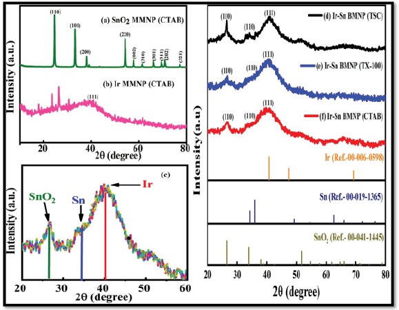 The X-ray diffraction technique has been employed to examine the crystal structure and crystallinity of surfactant assisted Ir, Sn nanoparticles. The XRD pattern of Ir MMNP (CTAB), SnO2 MMNP (CTAB) and Ir-Sn surfactant assisted BMNP samples are demonstrated in Fig. 4. In Fig. 4 (a), four distinctive peaks of CTAB assisted SnO2 MMNP sample have been observed at 26.5˚, 33.8˚, 37.9˚, 54.7˚, 57.7˚, 61.5˚, 66.2˚, 69.5˚, 71.3˚, and 77.4˚ with miller indices (hkl) value (110), (101), (200), (220), (002), (310), (301), (311), (202), and (321) respectively. The data of this sample is exactly matched with the JCPDS (card no. 00-041-1445), which indicates the formation of tetragonal rutile-like SnO2 MMNP sample. Also in Fig. 4 (b), only one peak of the CTAB assisted Ir MMNP sample has been observed at 41.1˚with (hkl) value (111) plane, which matched with (card no.00-006-0598). Fig. 4 (d, e, and f) the XRD data of Ir-Sn surfactant assisted BMNP (CTAB, TSC, TX-100) samples have been demonstrated with JCPDS card no.(00-041-1445 (for SnO2), 00-019-1365 (for Sn), and 00-006-0598 (for Ir)), those are confirmed the Ir is presented in metallic state and Sn is present in metallic and tin oxide form. Broad peaks at about 40.8˚ with (hkl) value (111), peak at 34.15 with (hkl) value (110), and the peak at 25o with (hkl) value (110) corresponds to Ir(0), Sn(0), and SnO2 respectively. These peaks represent the amorphous nature of the bimetallic nanoparticles. The comparison of the data between SnO2 and Ir MMNP, and Ir-Sn surfactant (CTAB) assisted-BMNP samples show shifting in 2 theta value from 41.1˚ to 40.8˚ and 26.5˚ to 25o due to some interaction among iridium (Ir) and tin (Sn). The Fig.4 (c) demonstrated the broad peaks of Ir-Sn surfactant ( CTAB, TSC, and TX-100) assisted BMNP samples, and all broad peaks reveals presence of some amount of Ir-Sn alloy along with SnO2 in the structure of Ir-Sn BMNP samples, which confirm the formation of bimetallic nanoparticles with FCC lattice. Approximate crystallite size (D) of all the samples has been evaluated by employing Debye-Scherer equation-