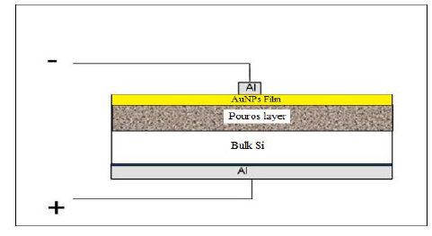 Gold nanoparticles (Au NPs) prepared by electrolysis cell. The electrodes of this cell consist of a Mo plate as a negative electrode and Au layer as a positive electrode, and the dimensions of both layers (3, 2 and 0.2) cm in length, width and thick respectively. The anode of this cell connected in series DC voltage (5 volts). 80(water):10(HCl) was used as an electrolyte liquid and the reaction time was about 30 minutes. The drop casting method was used to deposit colloidal Au NPs on glass substrate (2x2) cm2 to prepare thin films. In an ultrasonic bath, these substrates are washed with alcohol to eliminate impurities and residuals from their surface. In the preparation of the Au thin film on glass substrates, three drops of colloidal Au NPs were used. Same process used to deposit colloidal Au NPs on PS/Si heterojunction to produce Au NPs/PS/p-Si solar cell as shown in Fig. 1.