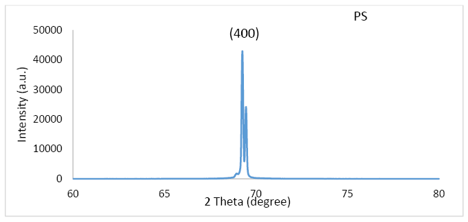 XRD of the Au NPs and p-type PSi were tested by kα Cu source line of 1.543 Å wavelength as mentioned above. XRD patterns of p-type PSi and AuNPs are shown in Fig. 2 and Fig. 3 respectively. Fig. 2 shows the XRD pattern of p-type PS layer which show single crystalline structure of this material, but it has significant peak broadening corresponding to the diffraction angle (69.28°), which is interpreted as nanocrystalline size effect.