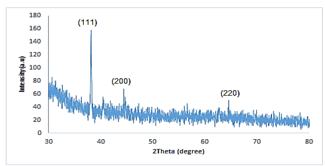 Fig. 3 Shows XRD pattern of Au nanostructures (Au NSs) deposited on glass substrate. The XRD pattern contains three main peaks at 2θ=38.12°,44.3°and 64.6° all three peaks corresponding to standard Brag reflections (111), (200) and (220) of face center cubic lattice. The broadening of the stronger peak at angle 38.1294° which give evidence of formation the nanostructure. The sharp peaks are match with the standard peaks of gold (JCPDS file:04-0784). The multi-peaks in the XRD pattern of Au NSs which indicated that the material had the polycrystalline structure.