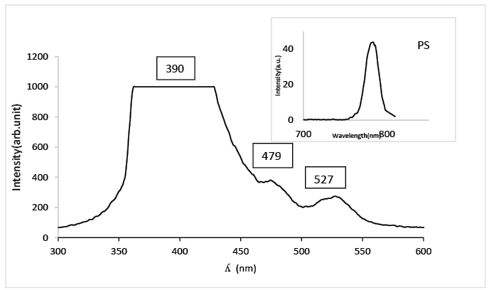 The photoluminescence(PL) spectrum of Au NPs in Fig. 6 shows a peak at 527nm which can be indicated to the local surface Plasmon resonance band of Au NPs. PL spectrum have other different peak positions at 479nm and 390nm may be attributed to formation of AuNPs in different sizes, and this result agree with others[15].While the inset figure shows the PL spectrum of PS , it characterized by the presence of one sharp peak in red band region(780nm) which refers to the fundamental absorption of PS.