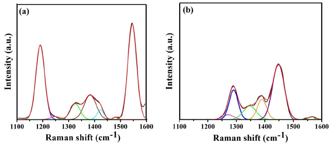 Output data have been recorded from dried drops of every suspension on glass substrates. As shown in Fig. 2a, the Raman spectrum of produced sample in liquid nitrogen medium exhibits main characteristic peak at 1545 cm-1 correspond to the G-band and asymmetric Raman intensity distribution in the range 1100-1460 cm−1. Therefore, the individual peaks of Raman spectrum were deconvoluted using Gaussian peaks to give the structural information in detail. The most intense peak appears at 1190 cm-1 in this spectrum is originated from highly disordered and wrinkled (defective) morphology of the graphene nanosheets [40], while the characteristic peak observed at around 1248 cm-1 corresponds to covalent C-N single bonds [41]. This result is in a very good agreement with XRD pattern. Furthermore, the individual peaks located at ~1380 cm-1 and 1325 cm-1 are belonging to the D-band and frequency of diamond lattice, respectively. Owing to phonon confinement effect, a triple-degenerated Raman band at 1333 cm−1 of bulk diamond crystal shifts to 1325 cm−1 in the 2-5-nm nanodiamond [42]. In addition, the other additional peak appears at ~1422 cm-1 and 1479 cm -1 in this spectrum are assigned to the vibration frequencies of Hg (7) mod from the C60 fullerene molecule and nanocrystalline diamond (NCD) [43, 44]. With changing the laser ablation environment to the CTAB solution, the Raman spectrum indicates change in the bands position and the shape (see Fig. 2b). The D-band for the GO nanosheets produced by 0.1 M concentration of CTAB is observed at the wave number of 1347cm-1, while the G peak shift to higher wave number at 1565 cm-1 and becomes broadens. The change in the position of the G band is typically associated to a modification of the electronic structure of the carbon nanomaterial, being shifted to higher frequencies in the presence of electron-acceptor groups [35, 45]. In fact, the trimethylammonium moiety of CTAB molecule can act as an electron-acceptor group, thus causing a shift of the G band to higher wavenumber [45]. Moreover, the additional peaks at the wave numbers of 1290 cm-1 1389 cm-1 can be seen in this spectrum which can belong to the carbon dioxide structure in the suspension [46]. The prominent peak appearing at 1447 cm-1 can be attributed to the nanodiamond [47]. Furthermore, another characteristic peak at 1271 cm-1, is also clear, which is associated with SP3 diamond bonding in tetrahedral amorphous carbon (ta-C) films [48]. The disorder-induced D band to that of the G band (ID/IG) has been widely used to acquire quantitative information about the amount of defects in the structure of carbonic materials and it is inversely proportional to the average crystallite size of SP2 domains [49]. As can be seen in Raman spectrum of produced sample in liquid nitrogen medium (Fig. 2a), the prominent G band with intensity compared to the D band is suggestive of minor structural defects and disorders in graphene nanosheets which are produced in this cryogenic medium. In present investigation we observed that the intensity ratio, ID/IG, for the sample produced in CTAB solution was 4.67 and decreased to 0.26 in liquid nitrogen medium. In order to determine the average crystallite size of the SP2 domains in graphene nanosheets, we employed the Tuinstra and Koenig relation, which relates the ratio of D and G bands intensities into the crystallite size as follows [27, 37]: