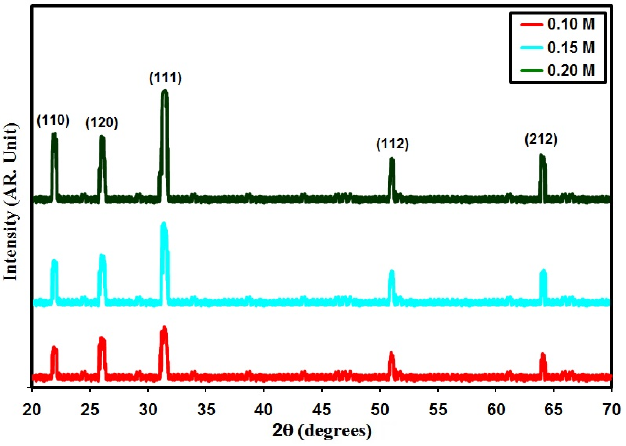 Fig. 1, represent XRD styles of SnS films that are grown through the use of TSC (0.10–0.20 M) various concentrations . All peaks of SnS thin films are matched orthorhombic structure. The dominant peak was (111) plane is actually agrees with (ICDD card no.: 39-0354) [29].