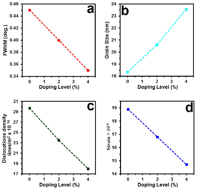 The FWHM is represented in Fig. 2, Grain size, Dislocation density and Strain versus doping content. The inverse relationship between crystallite size and other parameters are noted in the Figure. Fig. 2 demonstrates β, D, δ and ε Strain versus doping.