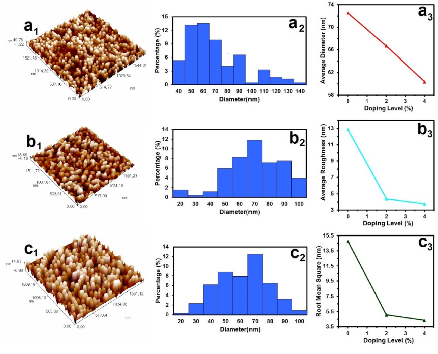 The SnS thin film surface morphology is studied through the use of AFM, as it is shown in Fig. 3 which shows AFM measurement technique that offers the digital images that allow of surface features quantitative measurements such as root mean square (RMS) or average roughness Ra that are shown in the Table 2. When taking two images with dimensions, Fig. 3 (a1, b2 and c1) 3D, it is noted that the films are regularly distributed in the small granules form connected without any spaces between them. Fig. 3 (a2, b2 and c2) shows curved volumetric distribution for crystalline granules where difference with TSC content from 0.10 M to 0.20 M respectively. From Fig. 3 (a3, b3 and c3), Ra and RMS values of (12.90, 4.39 and 3.76) nm and (14.80, 5. 08 and 4.34) nm, respectively, The above analysis shows that TSC content affect the values of Ra and RMS. Table 2 represent the values of AFM parameters.