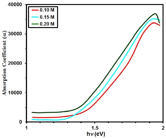 Where A is a constant, the relations are plotted between (αhν) 2 and hν. From Fig. 6 we can conclude that the bandgap depends on the TSC content, Eg decreases as TSC concentration increases. The bandgap of nanocrystalline SnS films depends on the content of TSC from 0.10 M to 0.20 M its values were 1.45 and 1.25 eV, respectively [55].