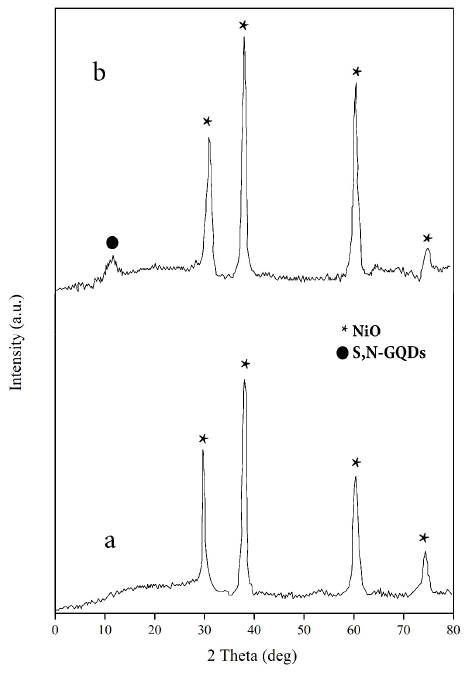 where β is the width of the observed diffraction peak at its half maximum intensity (FWHM), K is the shape factor, which takes a value of about 0.9, and λ is the X-ray wavelength (CuKα radiation, equals to 0.154 nm). The crystalline size was calculated 41 nm for NiO nanoparticles. The XRD pattern of prepared S,N-GQDs was presented in Fig. 2b. The broad peak at 24˚ relates to GQDs. XRD pattern of prepared S,N-GQDs is in good agreement with previously reported work [26]. Fig.1c shows the XRD pattern of prepared S,N-GQDs/NiO nanocomposites. XRD pattern reveals the formation of NiO nanoparticles and S,N-GQDs together. In comparison with XRD pattern of NiO nanoparticles, it is found that the width of peaks has been slightly changed in S,N-GQDs/NiO nanocomposites.