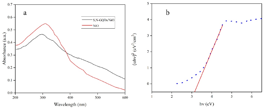 The optical properties of NiO nanoparticles and S,N-GQDs/NiO nanocomposites were studied via UV-Vis analysis. Fig. 4 displays UV-Vis spectrum of prepared NiO nanoparticles and S,N-GQDs/NiO nanocomposites. As well as shown in Fig. 4a, the optical absorption was centered at 314 nm for NiO nanoparticles. Fig. 4a shows UV-Vis absorption of S,N-GQDs/NiO nanocomposites. As well as known, the band gap of S,N-GQDs is lower than NiO nanoparticles. This leads to absorption and excitement of S,N-GQDs/NiO via visible light. It can be concluded that absorption extends to the visible region via S,N-GQDs in the S,N-GQDs/NiO nanocomposites.