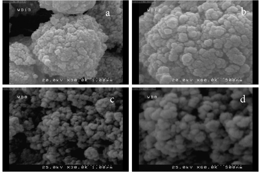 FESEM analysis was applied for morphological investigation of products. Fig. 3a, and Fig. 3b presents SEM images of as-prepared NiO nanoparticles at two different magnifications. It can be concluded that homogenous 75nm NiO nanoparticles are synthesized via the applied procedure. Fig. 3c, and Fig. 3d shows SEM images of S,N-GQDs/NiO nanocomposites at two magnifications. The images confirm the formation of very tiny GQDs alongside NiO nanoparticles. It is found that the size of NiO nanoparticles in pure NiO and S,N-GQDs/NiO nanocomposites are different significantly. It can be attributed to the applied synthesis procedure of S,N-GQDs/NiO nanocomposites which use S,N-GQDs solution instead of water. The S,N-GQDs and water provide different pH that can be lead to different sizes. Also S,N-GQDs act as a capping agent and prevent the agglomeration of NiO nanoparticles.