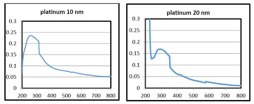 Fig. 2 shows the surface plasmon resonance (SPR) of PtNPs in DDW. SRP were measured at room temperature, the peaks of absorption were found at (265-292) nm for both PtNPs in DDW. The smaller nanoparticles show a higher amplitude than larger particles.
