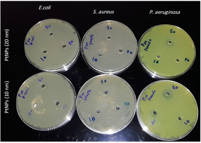 It is well known that smaller NPs exhibit greater antibacterial activity than larger NPs. In this regard, Platinum NPs are easy to produce in small size (less than 5 nm) making it powerful antimicrobial agents due to their electrocatalytic properties. Pt NPs kill bacteria through the production of reactive oxygen species [7].
