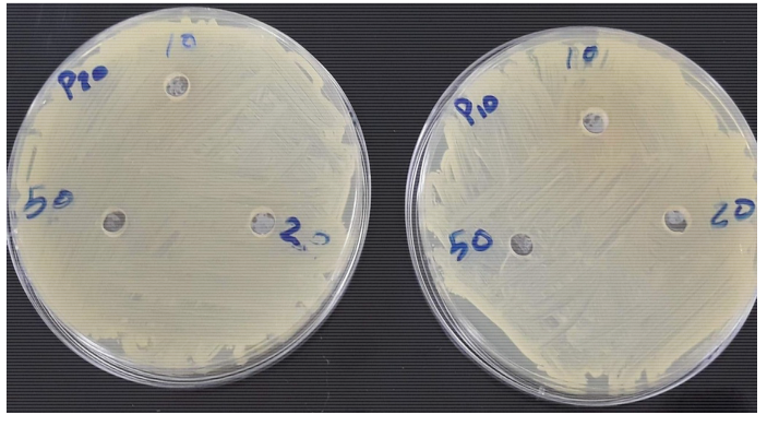 Antimicrobial activity of PtNPs was assisted using the well diffusing method according to Balouiri et al [11]. Muller-Hinton agar plates were prepared and incubated overnight before using for detecting the antimicrobial activity. Wells of 0.6 cm diameter were made on the agar plates using sterile gel puncture before culturing. The prepared dilutions of the bacteria and yeast were spread on the plates (100µl). A volume of 50 µl of PtNPs suspension was dispensed into each well using a micropipette. Three concentrations were used (10,20, and 50 µg/ml) in each plate. For evaluating the antifungal activity, the same procedure is used but on Sabouraud’s dextrose agar. The plates were incubated at 37C0 for 24 h. After incubation, the presence of a growth inhibition zone around the sample loaded well was observed and measured using a measuring scale.