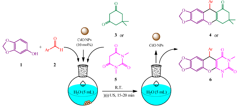 Though several methods for the synthesis of xanthenones and [1]benzopyrano[d]pyrimidinediones have been reported [28-32], but due to their particular importance, the improvement of new synthetic approaches by mild reaction conditions remains enough scope for an efficient and reusable catalyst with high catalytic activity for the preparation of those. In the course of our studies for exploration of catalytic activity of nanomaterial in heterocyclic synthesis [33], we herein report the use of CdO NPs as catalyst for the preparation of a series of 7,7-dimethyl-10-aryl-6,7,8,10-tetrahydro-9H-[1,3]dioxolo[4,5-b]xanthen-9-ones 4 and 6,8-dimethyl-10-aryl-6,10-dihydro-7H-[1,3]dioxolo[4΄,5΄:6,7][1]benzopyrano[2,3-d]pyrimidine-7,9(8H)-diones 6 by the cyclocondensation reaction of 3,4-methylenedioxyphenol 1, aromatic aldehydes 2, and active methylene compound including dimedone 3 or 1,3-dimethylbarbituric acid 5 under ultrasonic irradiation at room temperature in water (Fig. 1).
