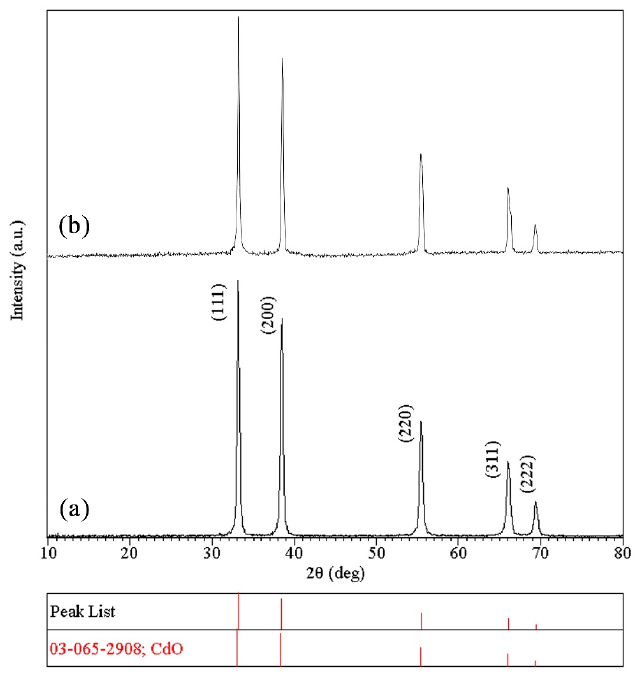 The crystal structure and phase composition of the synthesized CdO NPs were determined by XRD pattern (Fig. 3a). The cubic phase of CdO (JCPDS No. 03-065-2908) was confirmed and the diffraction peaks corresponding to the planes (111), (200), (220), (311), and (222) are obtained at 2θ = 32.99˚, 38.27˚, 55.25˚, 65.86˚, and 69.21˚ respectively.