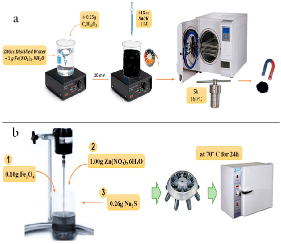 Firstly 0.1 g of synthesized Fe3O4 was dispersed in 200 ml of distilled water. It was mixed on mechanical stirrer for 30 minutes. Then 1.00g of Zn(NO3)2 6H2O was dispersed for 10 minutes. Then 0.26g of Na2S added to the solution and was mixed for 20 minutes. The product was then dried in oven at 70° C for 24 hours. Fig. 1b shows the schematic diagram of experimental setup for preparation of nanoparticles.