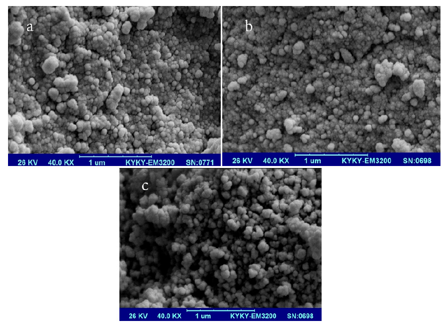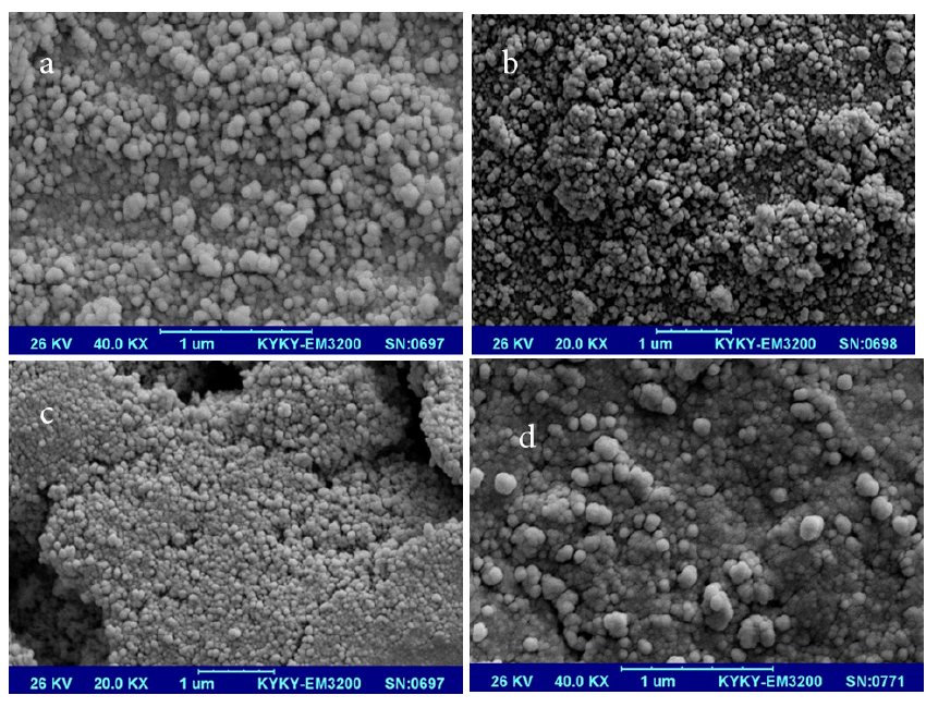 Fig. 2d shows the XRD pattern the Zinc sulphide -iron oxide composite. The average crystalline size for iron oxide, Zinc sulphide and nanocomposites were found to be about 30 and 50 nm respectively. SEM analyses show (in three different magnifications) the formation of essentially spherical Zinc sulphide nanoparticles (with CH4N2S as deposition factor) and the agglomeration of particles can be observed (Fig. 3a). The image also indicate that the nanoparticles with average diameter size of less than 55 nm were prepared. Fig. 3b exhibits SEM image of Zinc sulphide nanoparticle (with C6H10O5 deposition factor) with average size of less than 55 nm. Fig. 3c exhibits SEM image of Zinc sulphide (with a Na2S) nanoparticle with average size less of than 65 nm. Fig. 3d exhibits SEM images of iron oxide nanoparticles (with NH3 as deposition factor) that synthesized by hydrothermal method. The results approve formation of nanoparticles with average size of less than 30 nm. As can be seen, almost spherical particle morphologies have been created. Fig. 4a exhibits SEM image of iron oxide nanoparticle (with NaOH as deposition factor) which prepared by hydrothermal method. The results approve formation of nanoparticle with average size less than 50 nm. Fig. 4b exhibits SEM image of iron oxide nanoparticle (with C6H10O5 as deposition factor) that achieved by hydrothermal method. The results approve formation of nanoparticle with average size less than 45 nm. The nano-composites which their SEM image is presented in Fig. 4c, was synthesized with a iron oxide to zinc sulphide ratio of 1:1. Mono-dispersed product was prepared, that approve by addition of ZnS shell on the iron oxide core. Still the nanostructures with average size of less than 100 nm were synthesized.
