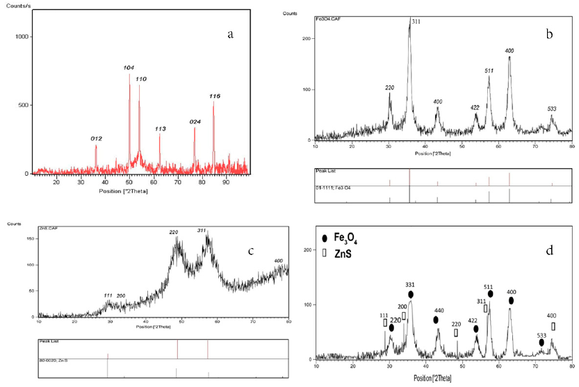 Nevertheless, the easy recombination of e-/h+ pairs in ZnS reduces the catalytic activity considerably. Additionally, the suspended ZnS photo-catalyst encounters important limitations such as the difficulty in separation, recovery, recycling and high cost in large scale production. Besides, ZnS nanoparticles have a tendency to agglomerate in aqueous solution and prevent the light penetration. In order to overcome to these difficulties, ZnS should be coupled with different magnetic semiconducting material. Many researcher groups have used chemical methods for synthesizing the ZnS nanoparticles [9-12]. Since Fe3O4 nanoparticles have magnetic property (high coercivity, low Curie temperature and super paramagnetic behaviour), they have been highly studied and exploited. Furthermore, they are non-toxic and biocompatible [13-18].