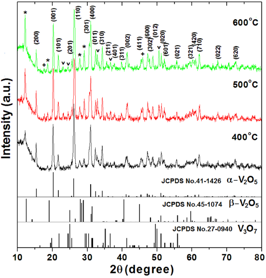 The XRD patterns of the V2O5 powders with the calcination temperatures (Tc) of 400, 500 and 600 °C are shown in Fig. 1. All the samples are crystalline; this was expected since it has been reported that the crystallization of V2O5 starts upon heat treatment at 300 °C [22]. The sample calcined at 400 °C exhibits predominately the diffraction peaks belonging to α-V2O5 orthorombic phase with Pmmn space group (JCPDS file No. 41-1426) along with some additional sharp peaks at about 12.4, 18.9, 27.9 and 28.8 ° corresponding to (200), (221), (240) and (241) reflections of β-V2O5 tetragonal phase (JCPDS file No. 45-1074), respectively. There are also a few peaks of negligible intensity from V3O7 monoclinic minor phase with C2/c space group (JCPDS file No. 27-0940). The coexistense of different vanadium oxides minor phases has been reported for other attempts to synthesize vanadium pentaoxide [30-32], as well.