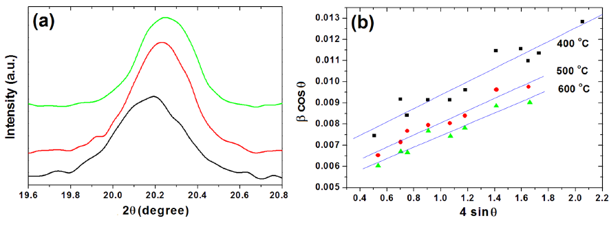 Another effect of the calcination temperature is also revealed from the enlarged peaks view in Fig. 2a as a reduction in the width of the diffraction peaks, i.e. a growth in the crystallite size. The Williamson-Hall (W-H) equation was used to determine both the crystallite size (D) and lattice microstrain (ε) of the synthesized particles based on the the full width at half maximum (FWHM) of the peaks: