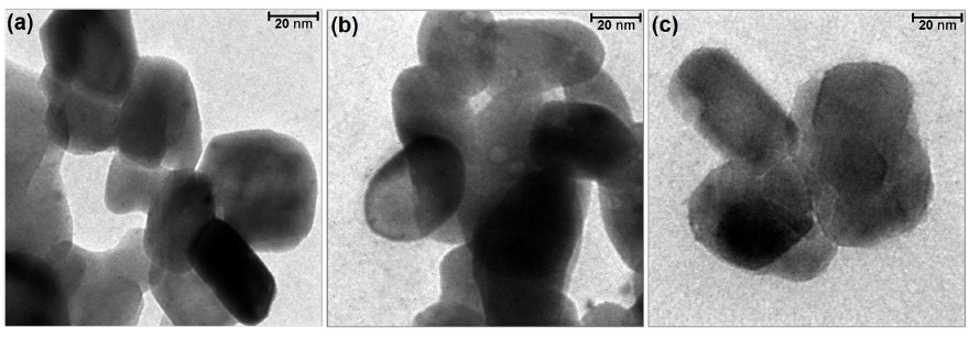 The morphology of the synthesized particles was studied by transmission electron microscopy. The TEM micrographs of the samples with different calcination temperatures in Fig. 3 represent that all the samples consist of individual spherical-like and oval-like nanoparticles of approximately uniform size. The effect of raising Tcal is revealed as the increasing number of the oval-shaped particles, probably due to the existence of a mixed phase, as well as a slight increment in their mean size. Regarding Fig. 3, the mean particle size of the samples with Tcal of 400, 500 and 600 ° are found to be about 34, 36.5 and 40 nm respectively, i.e. more than the crystallite sizes calculated from the XRD peaks width. This indicates the polycrystalline nature of the synthesized nanoparticles. The nanoparticles size growth with the calcination temperature is in good agreement with other reports (e.g. [39]) and was expected since on temperature increment, the tendency toward the minimum surface energy gives rise to larger particles with the less surface to volume ratio.