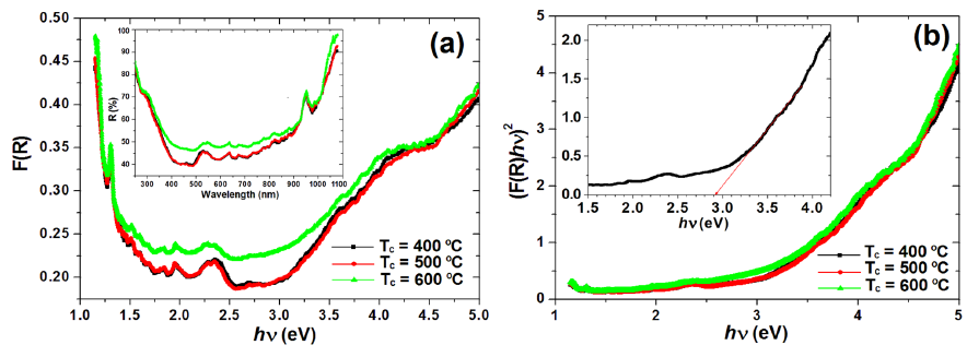 The room temperature UV-Vis diffuse reflectance spectra (DRS) of the involved nanoparticles in the wavelength range of 250 - 1100 nm are presented in the inset of Fig. 4a. To use the diffuse reflected data, they were recalculated by Kubelka-Munk (K-M) equation [40]: