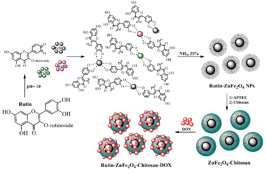 A main objective of cancer therapy is the possibility to selectively target cancer cell while do not affect healthy cells. To the best of our knowledge, the synthesis of chitosan-coated ZnFe2O4-doxorubicin NPs and their capacity of drug delivery was successively investigated by a glycosylated flavonoid, rutin. Rutin, a phenolic compound derived from plant extract, has been proven to be an effective reductant to the size of various nanoparticles. During the synthesis of rutin-ZnFe2O4 NPs, the substantial novelty was eliminating the N2 gas form the process. The structural properties of the synthesized NPs were comprehensively studied with FTIR, XRD, TEM, SEM, TGA, and VSM techniques. Capacity and efficiency parameters of the anti-cancer drug onto the NPs were obtained as equal to 43.5% and 78.6%. TEM experiment revealed that the average particle size of NPs was 18-32 nm. It is therefore found that releasing drug was more efficient in pH 6.4 rather than that of two other pHs, 7.4 and 5.2. Accordingly, the worthwhile properties of these NPs could be a golden line to further deep investigations. A comprehensive analysis of biocompatibility and toxicity of chitosan-coated ZnFe2O4-doxorubicin NPs should be done using appropriate cell lines based in vitro models and consequently in vivo animal models, using the standardized protocols. Besides, future research is warranted to validate the findings of the present study.