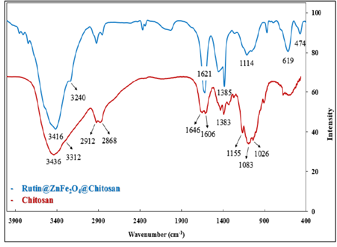 Fig. 3 illustrates the FT-IR spectra of chitosan and biosynthesized chitosan-coated ZnFe2O4 NPs, respectively, which were recorded in the range of 400‒4000 cm‒1. In general, the IR data of rutin’s chitosan-coated ZnFe2O4 NPs displayed a band 1621 indicating an interaction of the Zn2+ via the carbonyl (C-4) [23]. In chitosan spectrum, peaks at 1646 cm‒1 and 1328 cm‒1 indicate the presence of residual N-acetyl groups, which are approved the C=O stretching bands of amide I and C-N stretching bands of amide III, respectively [24]. In respective manner, shifting peaks to 1621 cm‒1 and 1385 cm‒1 of the biosynthesized NPs spectrum ascertain the hydrogen bonding of chitosan in the blend as well. A wide band in the 3436 cm‒1 is related to N-H stretching, O-H stretching and the intermolecular hydrogen bonds of chitosan. However, the presence of APTES molecules, as cross linkers, is significantly documented by vibrational enlargement of both the primary amine (NH) and OH stretching groups. In this respect, a slight shift of the OH band (3416 cm‒1 for 3436 cm‒1) accompanied by the elongation and suppression of band 3312 cm‒1 is observed. This may also be due to the interaction of silicon (Si) and OH [25]. The absorption bands at 2912 cm‒1 and 2868 cm‒1 are assigned to the –CH3 and –CH2– residues in chitosan structure and the peak at 1383 ascribes to –C–O stretching of primary alcoholic group of chitosan. The peak shift to the lower wavelength (3416 cm‒1) is likely owing to hydrogen bonding in the blend of nanoparticles. In the FTIR spectrum of rutin-ZnFe2O4-chitosan, compared with the spectrum of chitosan, the 1646 cm‒1 and 1606 cm‒1 peaks of N-H bending vibration shifted to the lower frequency, 1621 cm‒1, are related to the reaction of the blend, which confirms the magnetic ZnFe2O4 NPs was coated by chitosan. Accordingly, the main cause of disappearing bands at 1026 cm‒1, 1083 cm‒1, and 1155 cm‒1 in chitosan corresponding to the C-O stretching, and asymmetric stretching of the C-O-C bridge, respectively [26, 27]. Moreover, the FTIR spectrum of rutin-ZnFe2O4-chitosan reveals the formation of spinel structured ZnFe2O4. Two typical IR absorption bands, 474 cm‒1 and 619 cm‒1, assign to the inverse spinel ferrite structure. The former indicates the stretching vibration of tetrahedral groups Zn2+O2‒ and the latter represents the octahedral group complex Fe3+O2‒ [28].