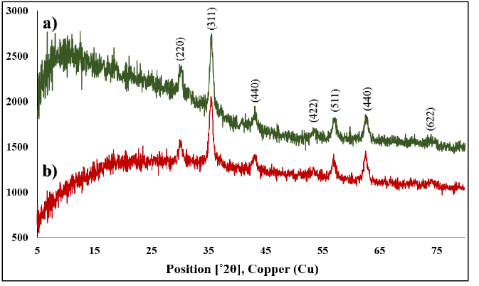 The XRD patterns of the rutin-ZnFe2O4 and rutin-ZnFe2O4-chitosan are indicated in Fig. 4. The presence of (220), (311), (440), (422), (511), (440), and (622) peaks in the XRD pattern of biosynthesized zinc ferrite NPs (Fig. 4a) are in accordance with a single-phase cubic spinel structure [29], which is in agreement with JCPDS standard cards no. 1012-22 with no extra impurity phases. The average crystalline size was estimated by the Scherrer equation, , from the X-ray peak broadening (FWHM; full-Width at half maximum) of the main peak (311), where λ is the wavelength of Cu K-alpha (1.79 Å), θB is the angle of Bragg diffraction, and β = B ‒ b. B is the full FWHM (0.58 ˚2θ) and b related to the instrumental line broadening [30]. On the whole, the crystalline size of biosynthesized ZnFe2O4 NPs was measured as about 17 nm using this equation. Fig. 4b also revealed that the ZnFe2O4 NPs coated by chitosan contain the ZnFe2O4.