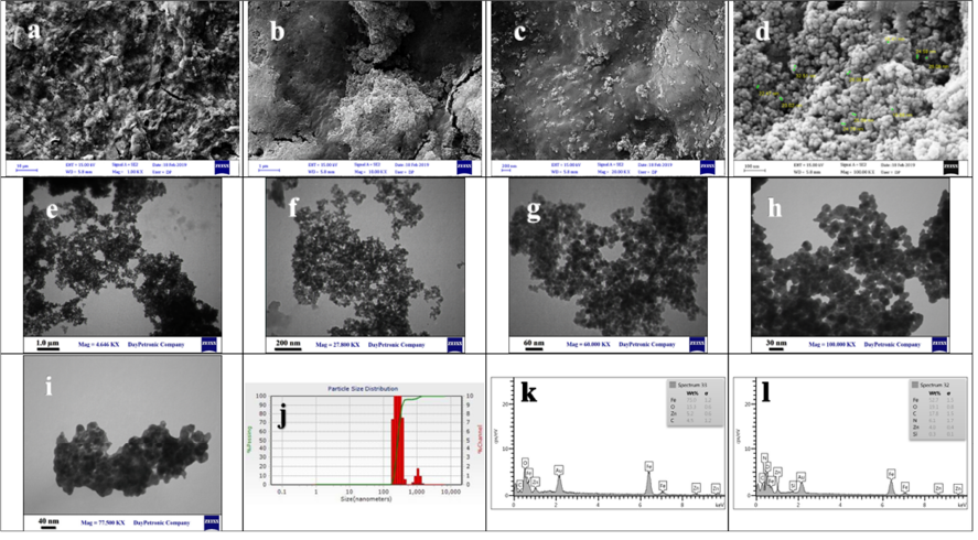Fig. 5a-e illustrates SEM image of ZnFe2O4 NPs at different magnifications that agree with the theoretical results measured by the Debye-Sherrer’s equation applied for estimation of average crystal sizes. TEM images with various magnifications were also evaluated for the morphology of biosynthesized magnetic nanoparticles (Fig.s 5f-i). Fig. 5g shows that ZnFe2O4 NPs are somewhat polydisperse and spherical shape with the average particle size of 18-32 nm, but strongly aggregated. The less agglomerated chitosan-coated ZnFe2O4 NPs, which can be seen in Fig. 5i, might be related to the steric barrier of chitosan playing as the stabilizing agent [26]. The same results were also obtained by Ignat el al., which the ZnFe2O4 NPs synthesized by the chemical method were coagulated and rod type with average size was 23.9 nm. By the way, coating by chitosan as a stabilizer has significantly decreased the size of ZnFe2O4 NPs [31]. The Dynamic Light Scattering (DLS) image (Fig. 5j) represents that the mean particle size diameter of the hydrogel beads (biosynthesized ZnFe2O4 NPs) are about 267.9 nm. In case of purity and elemental composition of rutin-ZnFe2O4 NPs and chitosan-coated ZnFe2O4 NPs, the analysis of energy dispersive X-ray spectroscopy (EDS) was applied. As can be seen in figures 5k and 5l, the EDS patterns obviously showed that biosynthesized ZnFe2O4 NPs either with or without chitosan were completely free from any kind of elemental impurities. The obtained results were in agreement with the chemical synthesis of ZnFe2O4 NPs carried out by Dhiman et al. [32].