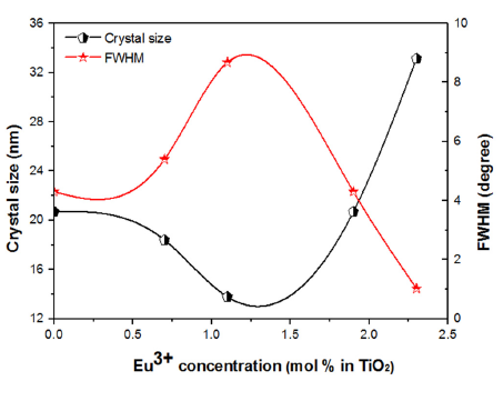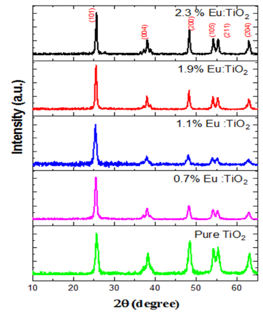 Several studies reported that by doping TiO2 nanoparticles with Eu, the crystal size decreased which is consistent with our study [3]. The effect of doping Eu3+ ions concentration on TiO2 nanoparticles was also studied. It was found that the crystal size reduced with increasing Eu content [18, 26].