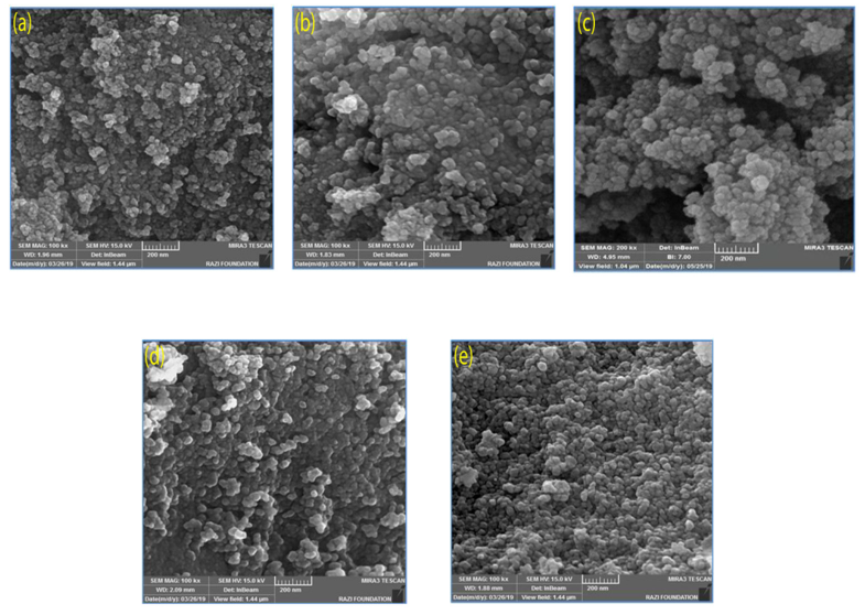 Field Emission Scanning Electron Microscopy (FESEM) was used to probe the changes in the morphology and particle size of the TiO2 powder. Fig. ٣ (a, b, c, d and e) shows the FESEM images of TiO2 powder doped with Eu = (0.0, 0.7, 1.1, 1.9 and 2.3 %), respectively. It was found that the average particle size of TiO2 before Eu doping is (30 ± 5 nm). It can be observed that the average particle size increases by increasing the doping Eu content. Moreover, the amplified images of the samples illustrate the growth and agglomerations of the nanoparticles due to doping with Eu. It was reported that the incorporation of europium into titanium dioxide by the sol-gel technique strongly affects the structural properties of TiO2, where the particles are joined together to form irregular shapes with size in the range from 3 to 136 µm [26].