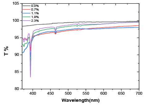 From the observation of the transmittance spectrum of titanium doped with Eu3+ Fig. 4, there is a behavior similar to that of pure titanium, and there is a clear concavity at the wavelength 394, as well as 464 nm.