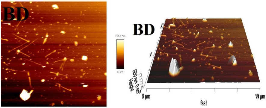 BD was morphologically evaluated by Atomic Force Microscopy based on previously explained method [11]. For this purpose, a drop of the nanoparticle suspension was poured on a mica surface and left at room temperature to dry. Then Atomic Force Microscopy (AFM) imaging (NanoWizard II AFM, JPK Instruments, Berlin, Germany) was performed using a tapping-mode in air at room temperature on a silicon-nitride cantilever with a spring constant of Nm-1. The obtained images were analyzed by a JPK information processing software (Germany).