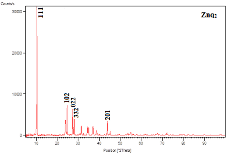 In this synthesis the ratio of zinc and Quinoline is 1:2. To do this, we dissolve ZnNo3 in a vessel containing 100 ml of water and separately dissolve quinoline in a vessel containing 100 ml of water, and place them on a magnetic stirrer for 1 hour to be dissolved well. Then mix both solutions in one container and add 0.5 ml of saffron extract and place container on a magnetic stirrer for 1 hour to achieve a uniform, green-yellow solution. Then we transfer the solution to the autoclave and place it in the oven at 150 °C for 15 hours. After 15 hours, we switched off the apparatus and after cooling the autoclave, the solution was transferred to another container to be centrifuged and precipitate. Then we rinsed precipitate with deionized water and placed it at 70 °C for one day to be dried.