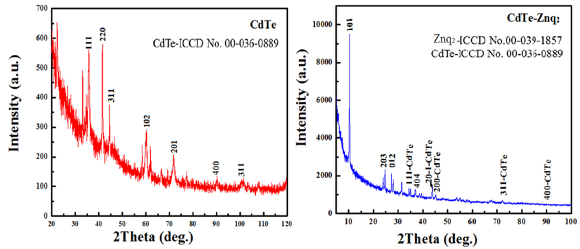 To do this, first the CdTe quantum dot was dissolved in a vessel containing 100 ml of water, then Znq2 was dissolved in another vessel containing 100 ml of water. After 1 hour, both solutions were mixed and placed on magnetic stirrer for 1 hour. Then the prepared solution was transferred to the autoclave and placed in the oven for 24 hours at 150 °C. After 24 hours we remove the autoclave and allow it to be cooled. Then transfer the solution to another container and this time it should be precipitated using a centrifuge. The solution was centrifuged several times, and then washed with deionized water over several steps to remove any impurities. Then put the final solution into the oven at 50 °C for one day to be dried.