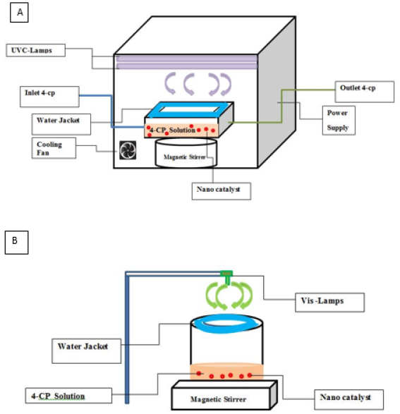 The efficiency of the photocatalysts was investigated as a target pollutant through the degradation of 4-CP. The experiments were carried out in a photo-reactor with a (30mm × 4mm × 4mm), with magnetic stirring (MR 3001 K, Heidolph). Photo-reactor system of UVC/La2O3 used in this study was surrounded by a water shell chamber to control the temperature during the reaction. As a light source, two UVC lamps were used with a wavelength centered at 254 nm (Philips, TUV 8W/G5 T5) and a metallic cover was put outside to separate other light sources. (Fig. 1). The solar experiments took place with a xenon lamp. Various quantities of catalysts were added to the aqueous solution containing 4-CP in both irradiation conditions. To determine the adsorption and desorption necessary for balance, the solution was stirred for 30 minutes without illumination. The reaction temperature was kept at 20–25 °C. By adding 0.1 N H2SO4 or NaOH and monitoring with a digital pH meter, the pH solution was changed (Jenway 3510).
