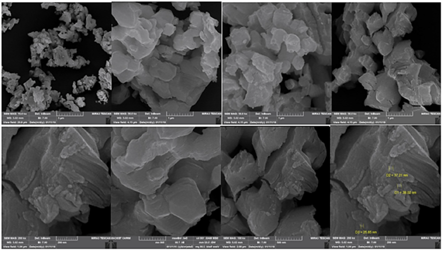 The particle size and morphology of LONPs were studied with scanning electron microscopy (FE-SEM) (Fig. 2). The particle size of LONPs were 25-38 nm. Using FESEM at different magnification and also its particle diameter displays, the grain size, shape and surface properties such as morphology were observed. It indicates that the particles are agglomerated.
