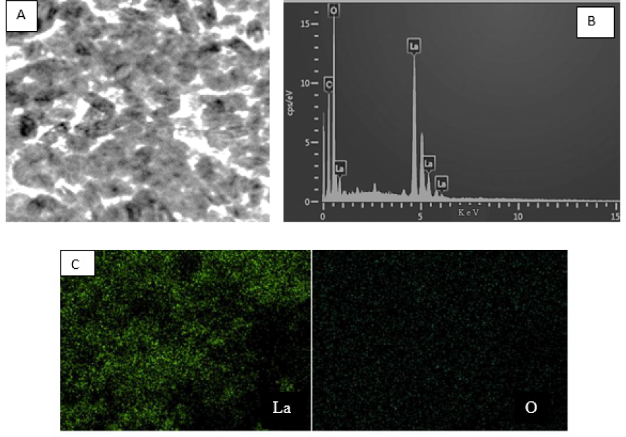 The Elemental X-Ray mapping of La2O3 samples is shown in Fig. 3c. Elemental X-ray mapping shows that the image of the spherically porous microstructure was observed in La2O3. Oxygen is rich in the matrix (57 %) and lanthanum is unequally distributed (43 %).