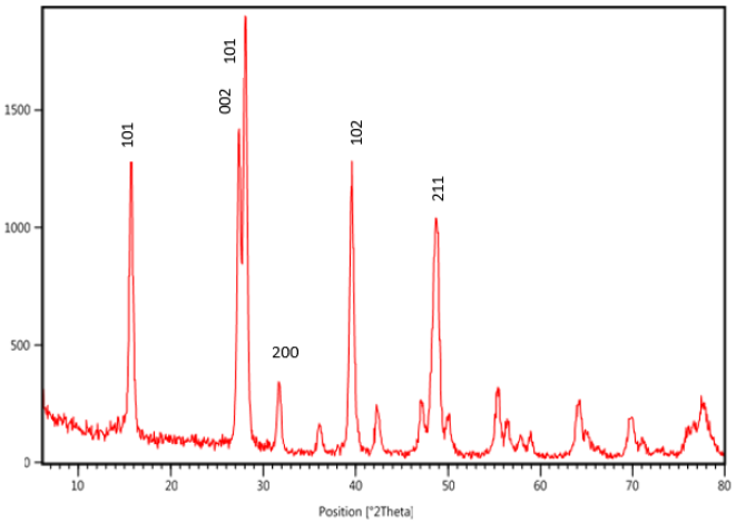 Fig. 4 shows the X-ray diffraction (XRD) patterns average crystalline size of LONPs. According to Fig. 4, the XRD patterns had peaks at 15.7°, 27.3°, 28°, 30.7°, 31.7°, 36.11°, 39.11°, 42.3°, 47.1°, 48.9°, 50°, 55.4°,56.4°, 57.86°, 58.8°, 64.2°, 69.7°, 71.1°, 72.8°, 55.8°, 77.6° by scanning in angular range (2Ɵ) from 10 to 80°. The 4 diffraction sharp peaks at 2θ =15.9°, 27.328.1°, 39.65°, 49.23° which is corresponding to (1 0 0), (0 0 2), (1 0 1), (2 1 1). This is in good agreement with the findings of littrature for the La2O3 [32]. The hexagonal step formation for La2O3 was confirmed by the XRD patterns acquired in the present analysis. The diffraction peaks (200) and (211) found in Fig. 4 were due to the small amount of La (OH)3 in the La2O3 powder [32, 33]. This is in good agreement with the standard Joint Committee on Powder Diffraction Standards card No: 50-0602. The extended peaks, are well illustrated polycrystalline properties, and size reduction of nanoparticles La2O3. The average crystallite size of anatase in the different samples can be evaluated by using the Debye-Scherrer formula on the main peak for anatase (2θ =28.1°):