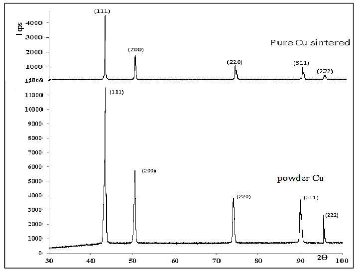 The X-ray analysis was performed for pure Cu powder, pure Cu sintered compact, and each fabricated Cu-TiC composite type. The phases that form the structure of pure Cu sintered compact ensured the success of the sintering process by means of the observation of the no other phases formed such as copper oxides. This is really clear from the X-ray graphs of the Cu powder and Cu sintered compacted samples shown in Fig. 1 are identical to the standard diffraction peaks of Cu (JCPDS, file No. 04-0836). The only difference that was detected in the intensity of the characteristic peaks of the Cu powder was greater than the corresponded peaks of that are belong to the sintered compacted Cu sample. XRD charts for micro and nano-size TiC powders explained in Fig. 2 that were used in the present study were matched with (JCPDS, file No. 03-065-8417) and the intensity of peaks of micro-size TiC powder was greater than their corresponded ones for nano size TiC powder. It seems from the Fig. 3 and Fig. 4 that depict the XRD charts for the
