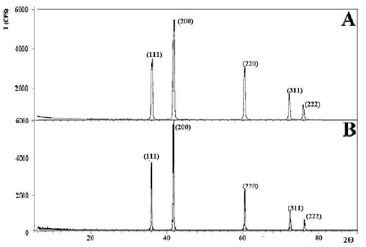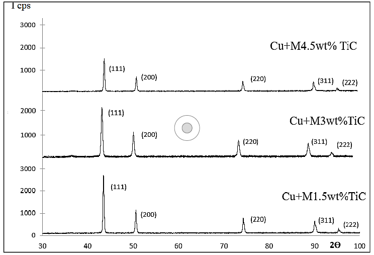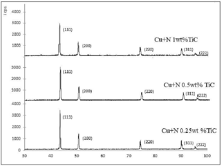 prepared Cu-TiC composites by several micro and nano TiC additions, respectively, that there is no hint to other phases formation except those referred to the α-Cu phase peaks which were also referred to it in the Fig. 1. It was clear from XRD charts for Cu-TiC composites that the amount of the TiC additions in both micro and nano types were very small in their amount that cannot be revealed by XRD analysis directly. But it is important to observe that the TiC additions made the α-Cu peaks to appear with lower intensity and the intensity of each peak was decreased by increasing the micro or nano-TiC additions. This situation of the XRD graph also demonstrated that there was no chemical reaction between Cu and TiC. XRD graphs obviously show that no oxide phase formed in Cu-TiC composites such as CuO [19,20].The decrease in the intensity with an increase in the content of TiC indicates that the level of arrangement of the atoms decreases in the composite and becomes somewhat less crystalline, this is what was seen from the Fig. 3. But from the observation of Fig. 4 the effect of the nano TiC addition on the value of the Cu peaks intensity was lower than addition of micro size TiC. The reason is mainly due to the lower produced localized strain energy.