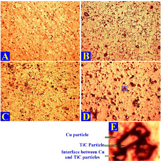 The optical micrographs of Cu-TiC composites with various wt% of micro-size TiC particles are illustrated in Fig. 5. The figure explains How the TiC particles distributed between Cu-particles and their area fraction was increased in the observed surface area by optical microscope by the increasing of the TiC wt%. The enlarged image E for a small area of Fig. 5-D shows the interface between the Cu and TiC particles which was free of cracks and porosity. This situation is more clearly displayed in the observed area from the Cu-TiC composite picked up by FESEM instrument as shown in Fig. 6 where TiC particles are well embedded among Cu particles with no cracks voids or porosities at interface positions between the two different particles. While Fig. 7 explains the presence of the microstructure its two main components and how small size TiC particles that resulted from the breakage of the TiC particle during ball milling and pressing process are distributed between Cu particles.
