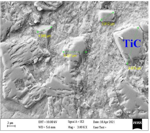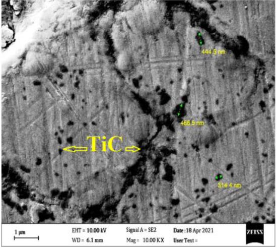 This distribution of the nano TiC particle is well detected by higher magnification power by the usage of FESEM facility as shown in Fig. 9 where TiC particles with black color are well imbedded within and amongst Cu particles as an interface. In turn Fig. 10 explains the presence of the microstructure its two main particles components and how nano-sized TiC particles were distributed at Cu particles boundaries also within the Cu particles where hard TiC ceramic particles are able to pin inside less hardness Cu particles during ball milling and pressing process as explained in Fig. 9.