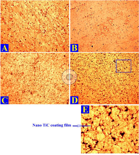 The optical micrographs of Cu-TiC composites with various wt% of nano-size TiC particles are illustrated in Fig. 8. The optical microscopy indeed does not clarifies exactly how the TiC particles are distributed between Cu-particles. Nevertheless, the approximately large amount addition of nano TiC particle which was 1 wt% made some variation in the microstructure particularly at Cu particles boundaries where TiC particles are formed a thin film between Cu particles in lots of positions while the cluster-like shape of several TiC nanoparticles are formed at