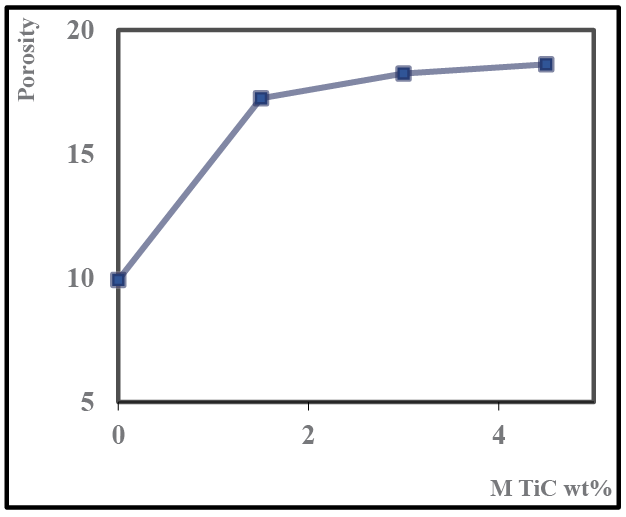 density change is reflected in the values of the calculated porosity of the Cu- nano TiC composites as illustrated in Fig. 14. The most important observation was that the addition of nano-sized TiC particles with values greater than 0.25 wt% tends to occupy the remained pores between the Cu particles during the pressing step which is well reflected in the decrease of the porosity value and increase of the density of the sintered sample.