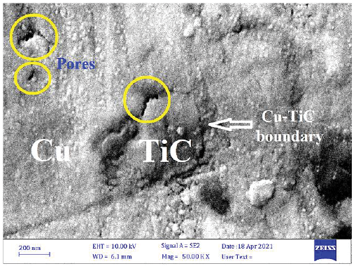 The formed pores in the sintered Cu- nano TiC composites were mainly existed at the interface zone between Cu and TiC particles as shown in Fig. 15, where the pores have irregular shapes as is explained in the areas denoted by yellow circles.