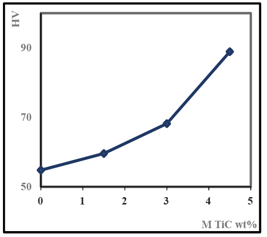 Cu dislocation density was enhanced by adding TiC particles to the mix. During indentation, the interaction between TiC particles and dislocation density increases microhardness. The dislocation density will increase as the volume fraction of TiC particles increases. As a result, with a greater volume percentage of TiC particles, the contact will be stronger, improving hardness even more. the hardness values of micro TiC - Cu composites increased from 54.8 to 88.9 HV with the addition of 4.5 wt % TiC as illustrated in Fig. 16. The immediate presence of hard ceramic particulates in a soft metallic matrix leads to an improvement in the hardness. The resistance to the transferred load from the Cu matrix to the TiC reinforcement is expected to be more because of the higher strength and hardness of the ceramic particles than the softer Cu matrix which may be another reason for higher hardness. When Cu powder was mixed with nano TiC particles in three weight fractions (0.25, 0.5, and 1) %. The hardness of the fabricated composite was improved as compared with pure Cu, where it reached the maximum value at 0.25 wt% TiC, then it decreased but its value remained higher than that for pure Cu sintered compacts, as shown in Fig. 17. The thought is due to the wider spread of the agglomerated nano TiC between Cu particles above the critical concentration (0.25 wt%) of the nano addition. Another factor that could have to participate to enhance the hardness initially is the effective “dispersion strengthening” by the introduction of nano TiC granules to the Cu matrix [22,23].