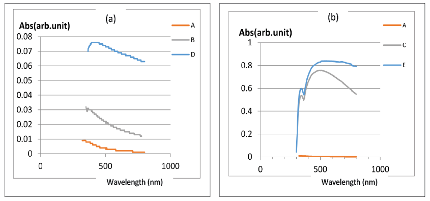 The Absorption spectra of thin films at the range wave number (300-800) nm were studies using spectrophotometer type (T80 UV/Vis Spectrometer). Fig. 2 show the relationship between the Absorption spectra as a function of the wavelength for PVP after adding KPF6 salt and TiO2 nanocomposite for it. From Fig.2a we see that decreases in the absorption spectra with increase wavelength for all ratios, but its increases with increase the ratio of KPF6 from (0.008) at the wavelength (354) nm to (0.076) at the wavelength (442) nm. And when replaced KPF6 with TiO2 nanocomposite as Fig. 2b, we get on better result represented by increases in the absorption spectra with increase weight ratio of added, the maximum absorption was (0.838) at the wavelength (556)nm. The materials can be crystalline and amorphous and having energy band gap (BG) that can be determined using the optical absorption spectrum. The electrons will be excited from the VB to the CB by the absorption spectrum to tackle the nature and quantification of the energy (BG). In this case the absorption coefficient (α) can be determined using the relation [12, 13]: